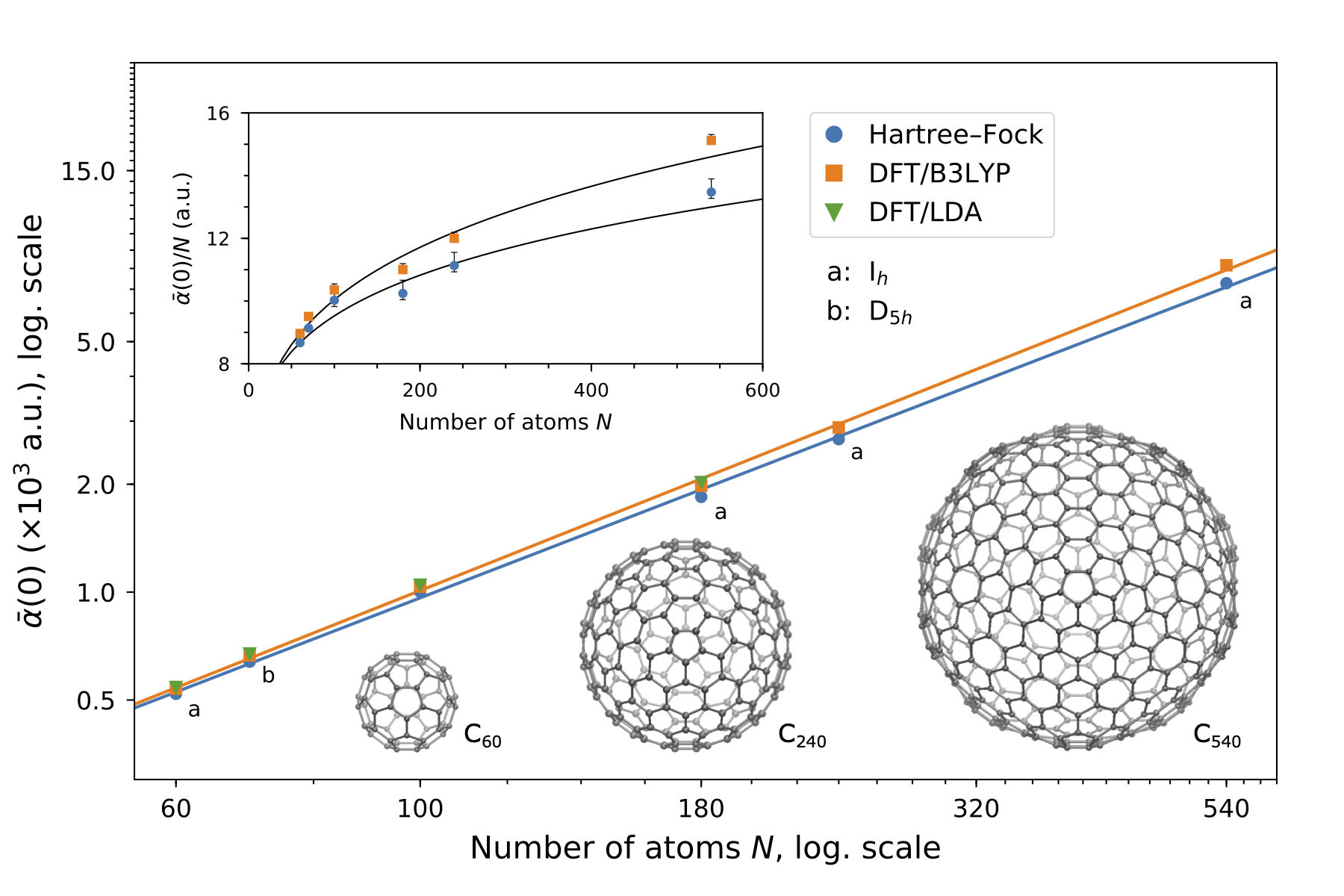 With a highly efficient implementation of the linear complex polarization propagator in VeloxChem, Hartree–Fock and Kohn–Sham density-functional theory calculations were performed of the frequency-dependent polarizabilities for fullerenes consisting of up to 540 carbon atoms. Results for the static polarizabilities and C6 coefficients show scalings of and , respectively, thereby deviating significantly from the previously reported values obtained with use of semi-classical/empirical methods. See Brand et al. (2021) for further details.