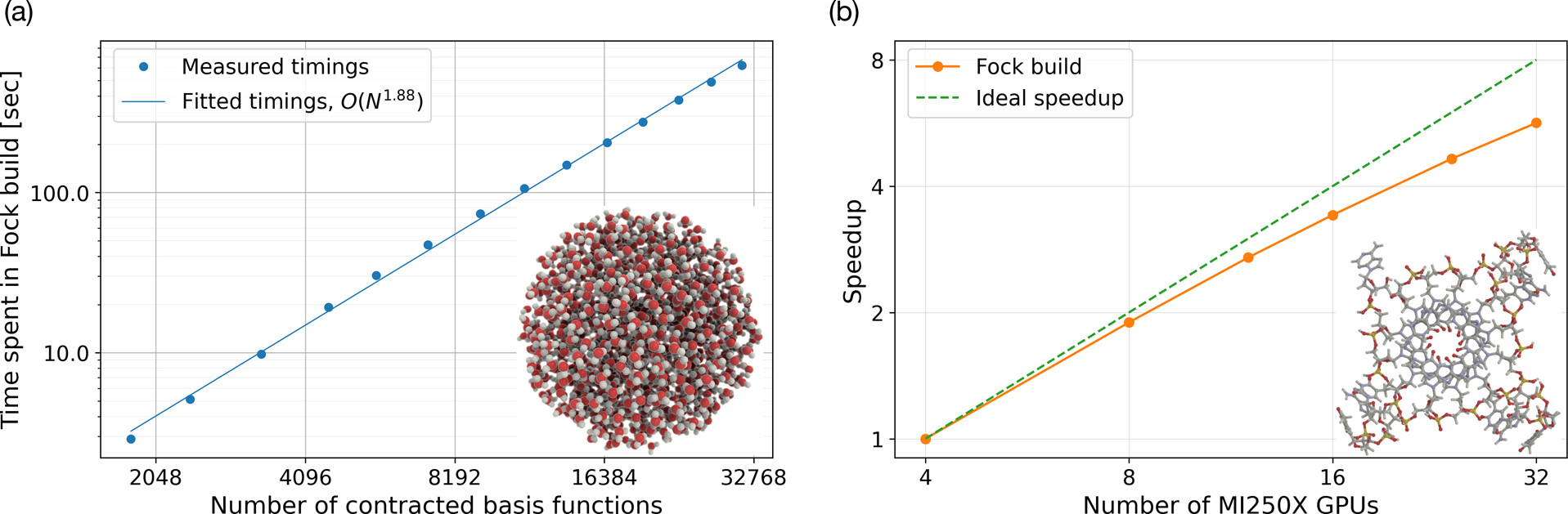 Two separate scaling aspects of the GPU implementation of the ERI-part of the Fock matrix construction can be shown: (a) a system size scaling illustrated by the wall times (in seconds) on a single GPU node obtained for spherical water clusters of varying sizes (the inset shows the largest cluster). (b) a strong scaling with respect to the number of GPUs (each with two GCDs), illustrated here by a G-quadruplex including all nucleotides where the phosphate group has been neutralized by adding a hydrogen. See Li et al. (2025) for further details.