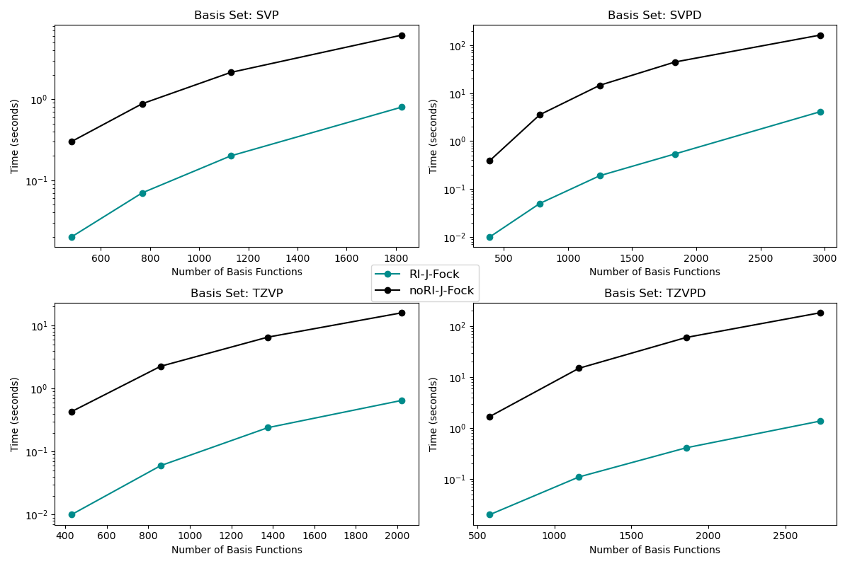 Timings are in seconds, measured on 1 LUMI-CPU node with 128 cores (8 MPI x 16 OMP). Systems are water clusters of different sizes. The time spent in one Fock-J build is measured with and without RI. Speedup can be 10x, 20x, 40x or 100x depending on basis set and system size