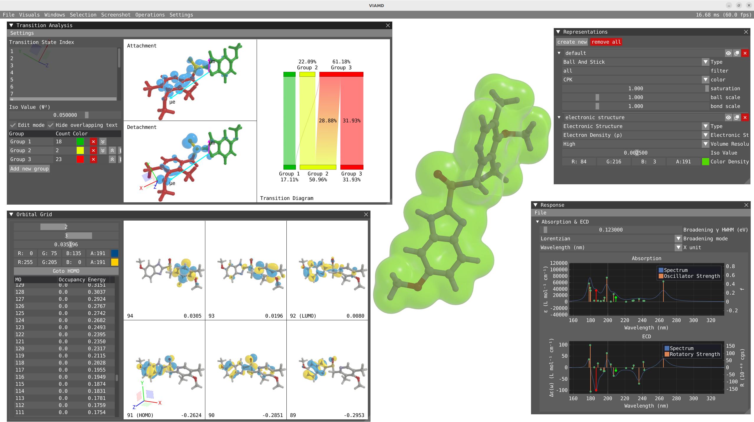 VIAMD natively reads HDF5 (*.h5) files produced by VeloxChem, which contain detailed orbital information. This enables users to efficiently render and analyze molecular orbitals and spectra from VeloxChem calculations with VIAMD, providing a powerful and seamless workflow for exploring quantum chemical calculations visually.